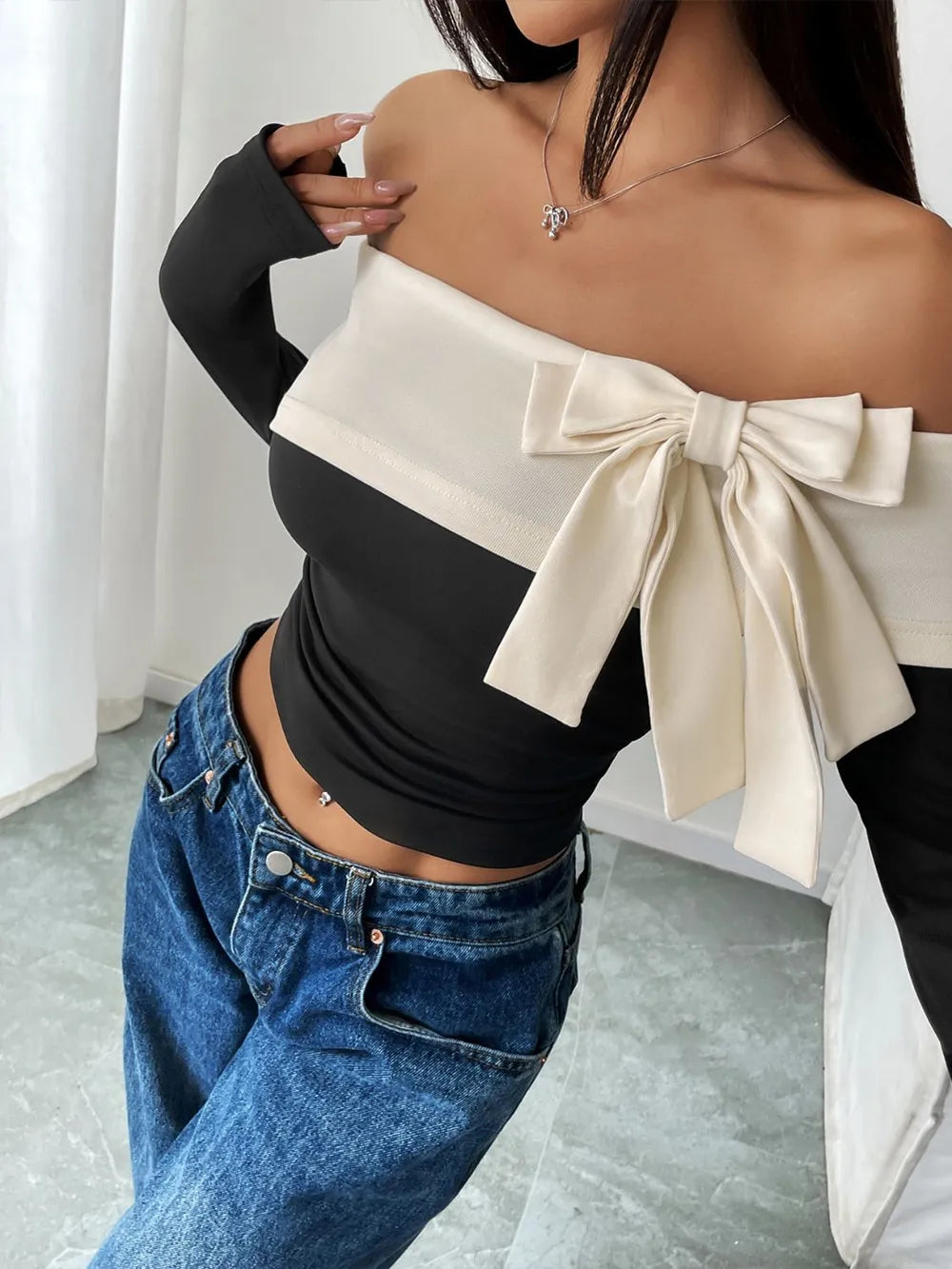 Perfee Bow Contrast Off-Shoulder Long Sleeve Top